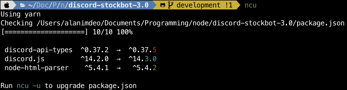 - 업데이트: 'ncu -u'를 입력하면 최신 버전으로 package.json을 자동으로 수정해 준다. 이후 'npm install(또는 yarn install)'으로 업데이트된 패키지를 설치하면 된다.