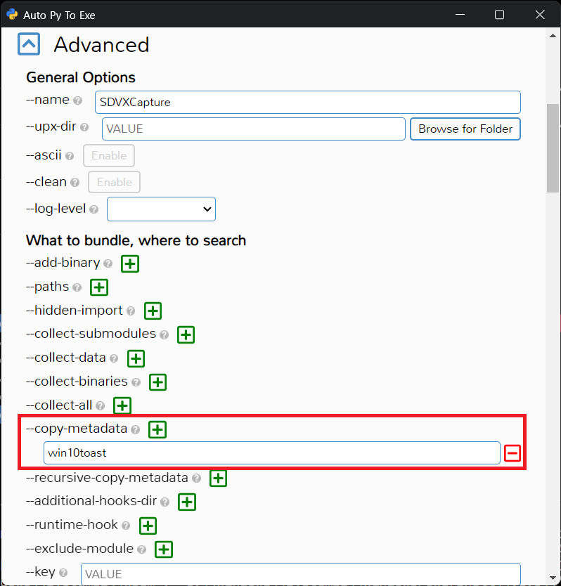 GUI 사용 시에는 Advanced > --copy-metadata 옆의 [+]를 누르고 win10toast를 입력하면 된다.