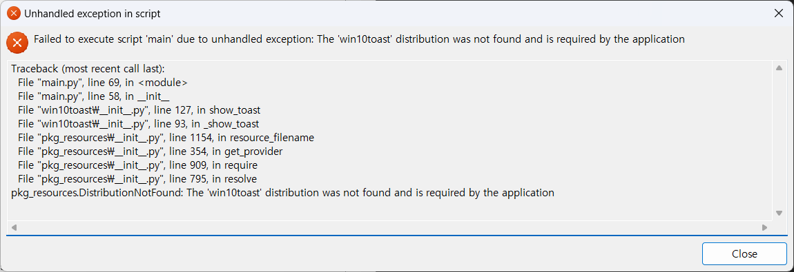 코드에 사용된 win10toast 모듈이 제대로 포함되지 않은 것 같다.